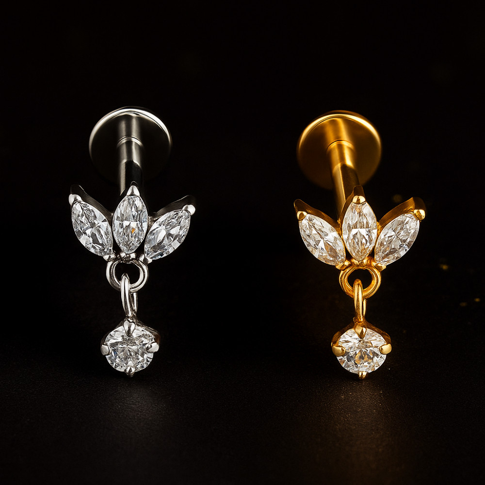 Se você procura uma joia discreta, sofisticada e de alta qualidade, essa é perfeita para destacar seu estilo com elegância. Este piercing pêndulo conta com três pedras de zircônia alinhadas e uma peça pendente, conferindo um brilho extra sem perder a delicadeza do design minimalista.